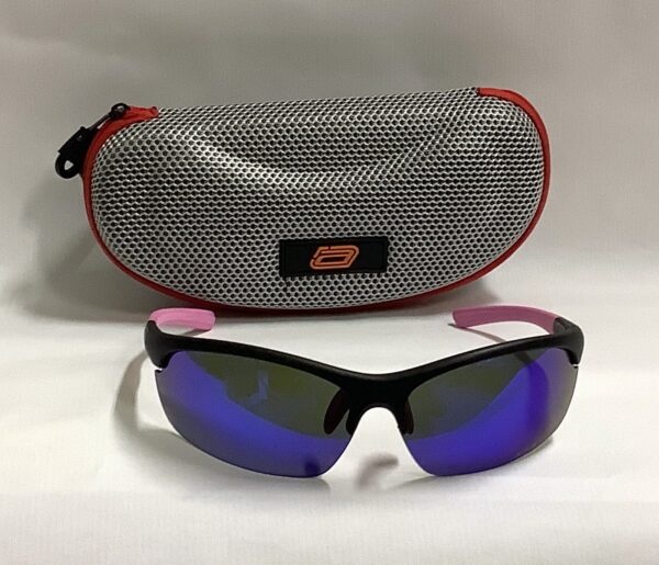 Gafa técnica deportiva. Frente negro, varillas negro / rosa. Lente verde espejo azul. Categoria 3. Recomendada para MTB y Trail